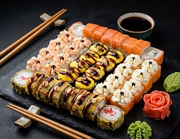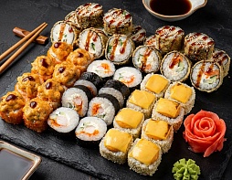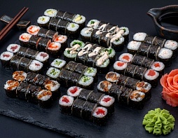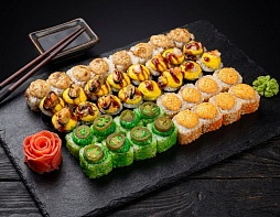 сырная мидия, огненный кальмар, запеченная фила, магуро, унаги-онигара с креветкой, (40 шт)