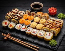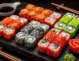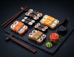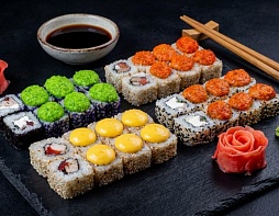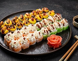 Эби чиз (сливочный сыр, креветка, огурец, масаго оранжевая); Темпурный окунь (сливочный сыр, окунь темпура, чука, ореховый соус); Фила темпура (сливоч...