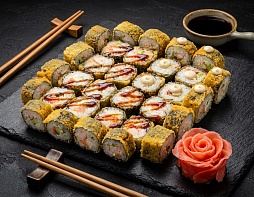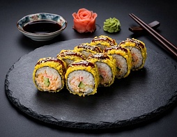 Состав: запеченный лосось, угорь, огурец, терияки, сыр, масаго (8 шт.)