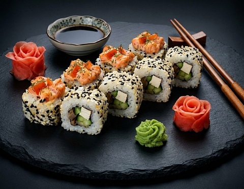нежный ролл с шиитаки, хрустящим огурчиком и тофу, в обсыпке из черно-белого кунжута, и всё это запекается под ароматной шапочкой из помидора с чесночным соусом